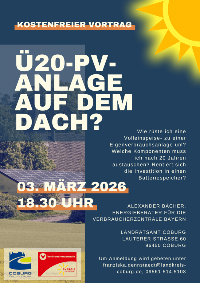 Wenn Ihre Photovoltaikanlage bald oder bereits älter als 20 Jahre ist und die EEG-Vergütung ausläuft, stehen wichtige Entscheidungen an. Ein Vortrag im Landratsamt Coburg am Dienstag, 03.03.2026 um 18.30 Uhr zeigt verständlich, welche Möglichkeiten es für den Weiterbetrieb gibt, ob sich die Nachrüstung eines Batteriespeichers lohnt oder ob man die Anlage doch lieber abbauen und verkaufen sollte. Nutzen Sie die Gelegenheit, diese Fragen vom kompetenten Energieberater der Verbraucherzentrale Bayern, Alexander Bächer, beantworten zu lassen.