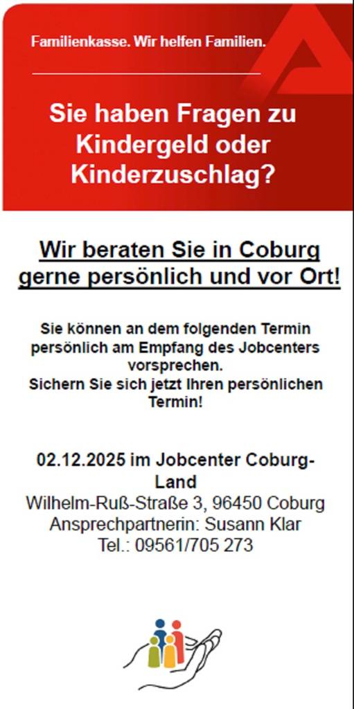 Der nächste Termin findet statt am Dienstag, 2. Dezember, im Jobcenter Coburg Land (Wilhelm-Ruß-Straße 3, Coburg). Die dafür empfehlenswerte Terminvereinbarung ist unter der Telefonnummer 09561/705273 möglich.