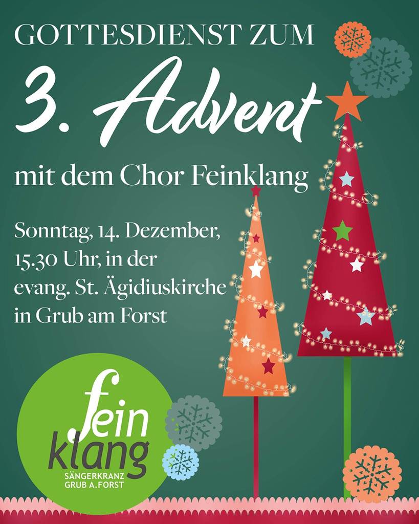 Die Evang.-Luth. Kirchengemeinde Grub und der Chor feinKlang vom Sängerkranz Grub laden herzlich zum musikalischen Gottesdienst am 3. Advent, 14.12. um 15.30 Uhr in die St. Ägidiuskirche ein. Im Anschluss gemütliches Beisammensein bei Glühwein, Früchtepunsch und Lebkuchen.