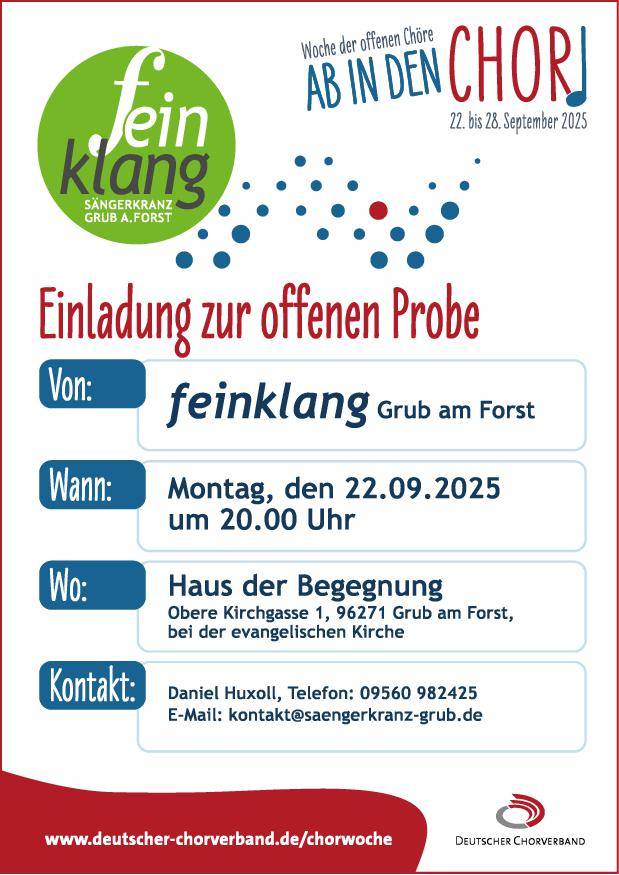 In der Schnupperstunde wollen wir zusammen ein neues, einfaches Stück einstudieren. Du kannst mitsingen, deine Stimme ausprobieren, oder einfach nur zuhören. Ob mit oder ohne Chorerfahrung, wenn du gerne singst, dann trau dich und komme um 20 Uhr bei uns im Haus der Begegnung in Grub am Forst (Obere Kirchgasse 1) vorbei – wir freuen uns auf dich!
